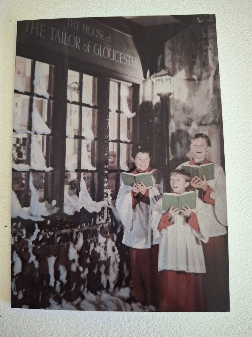 Pack of 10 Tailor of Gloucester Christmas Cards (with envelopes) depicting the snow draped shop window with 3 choir boys singing carols.(Script: With best wishes for Christmas and the New Year)